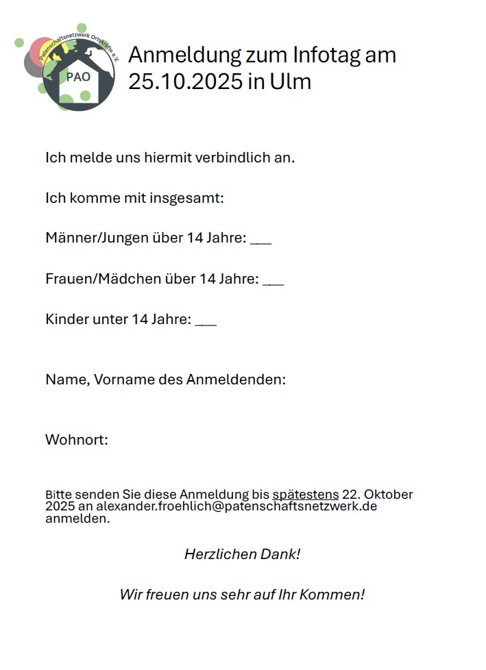 Melden Sie sich bitte verbindlich bis spätestens 22. Oktober 2025 per E-Mail bei alexander.froehlich@patenschaftsnetzwerk.de an oder geben Sie den ausgefüllten Anmeldezettel Ihrem/Ihrer Sozialarbeiter/in oder Integrationsmanager/in. Bitte beachten Sie: Es gibt nur begrenzten Platz. Nur mit einer Anmeldung können wir garantieren, dass für Sie und Ihre Familie noch Plätze frei ist!